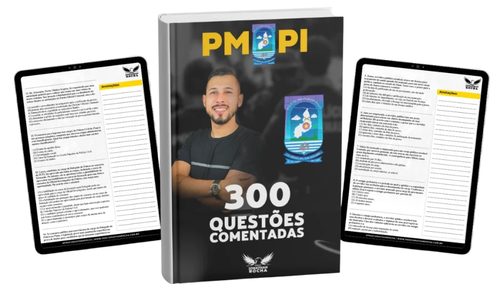Você terá acesso a 300 questões exclusivas da PMPI, todas inéditas e comentadas em detalhes, para que você estude de forma estratégica, entenda cada erro e foque no que realmente faz diferença na prova.